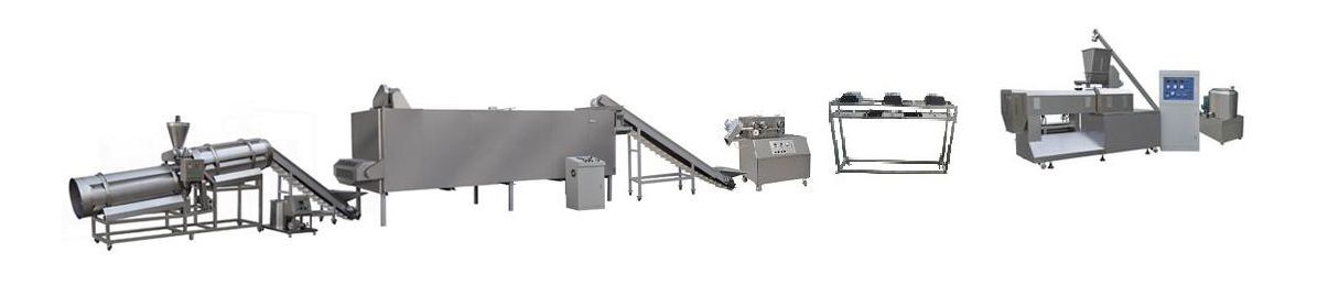 Materials Preparation→Mixing→Convey→Extruding→Injection→Cutting→Convey→Drying→Oil Spraying→Seasoning→Packaging